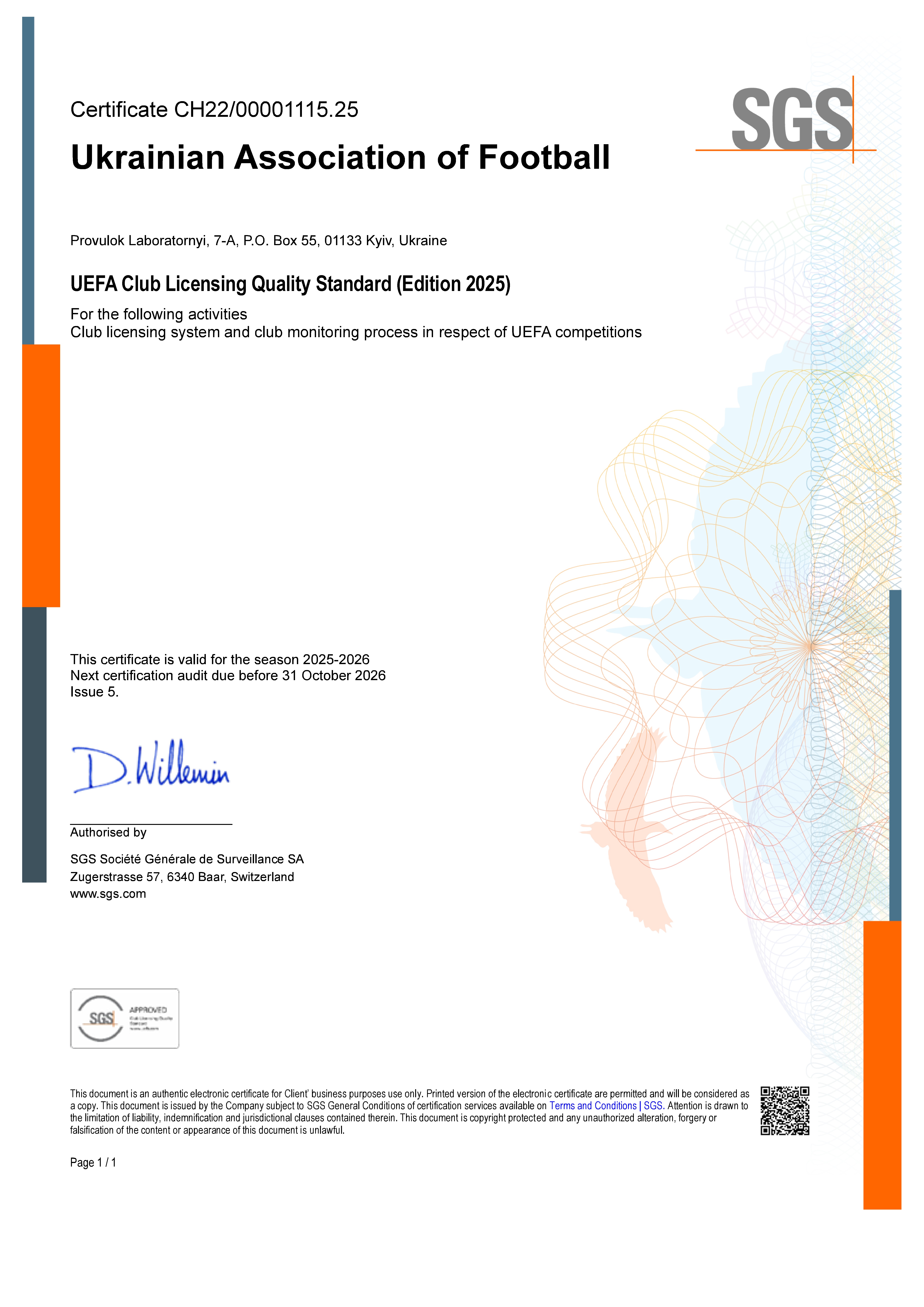 Після аудиту SGS, який відбувся у вересні поточного року, та ретельної оцінки наданих відділом з питань атестації та ліцензування клубів УАФ всіх необхідних документів, передбачених вимогами Стандарту якості ліцензування клубів УЄФА (Видання 2025 р.), Комітетом з валідації SGS Société Générale de Surveillance SA (Geneva) прийнято рішення видати Українській асоціації футболу сертифікат на 2025/2026 рр.